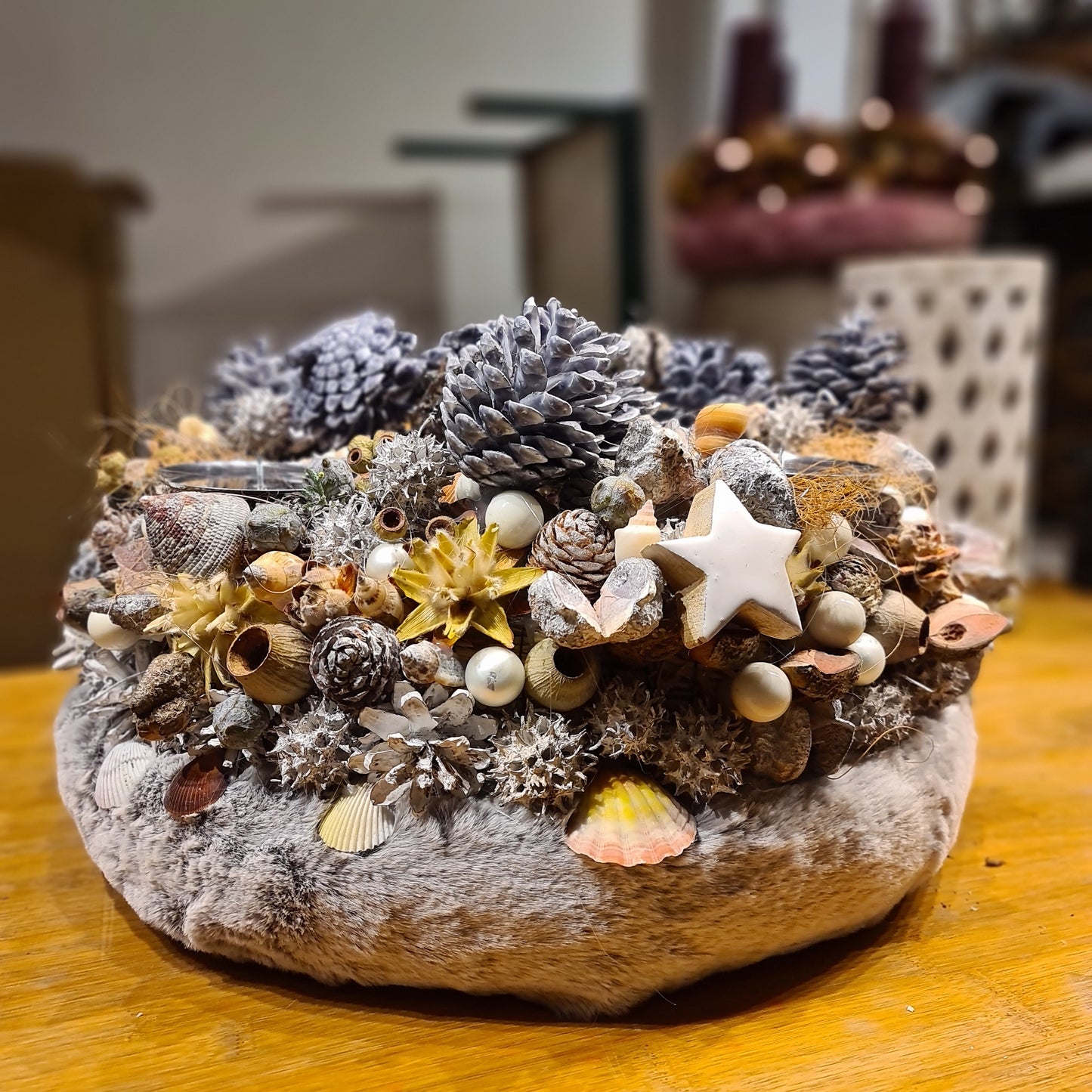 Sehr sorgfältig achte ich auf die Auswahl der Materialien. Hier habe ich verschiedene Weihnachtskugeln aus Glas, sowie Spiegelbeeren, Lärchen-, Föhren- und Fichtenzapfen, Holzsterne, Birkensterne und Eukalyptusglocken verwendet. Bei der Basis handelt es sich um einen sehr schön gearbeiteten weiß gekalkten Weidenkranz. Diese Weihnachtsdeko wird bei Ihnen bestimmt zum Hingucker.